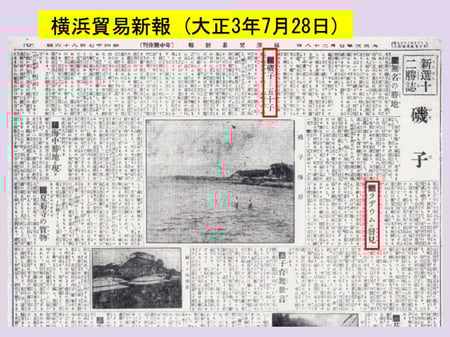 磯子の埋立に関する記事は、大正3年7月28日付の横浜貿易新報にも掲載された。しかし、明治41年3月10日の横浜貿易新報は今を伝えるニュースであったのに対し、こちらは磯子の名勝を伝える特集の中で葦名金之助を紹介するという形を取っている。それによると……