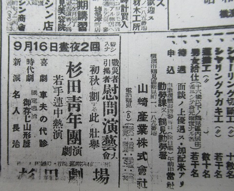 昭和21年(1946)9月16日付の神奈川新聞に掲載された杉田劇場の広告です。